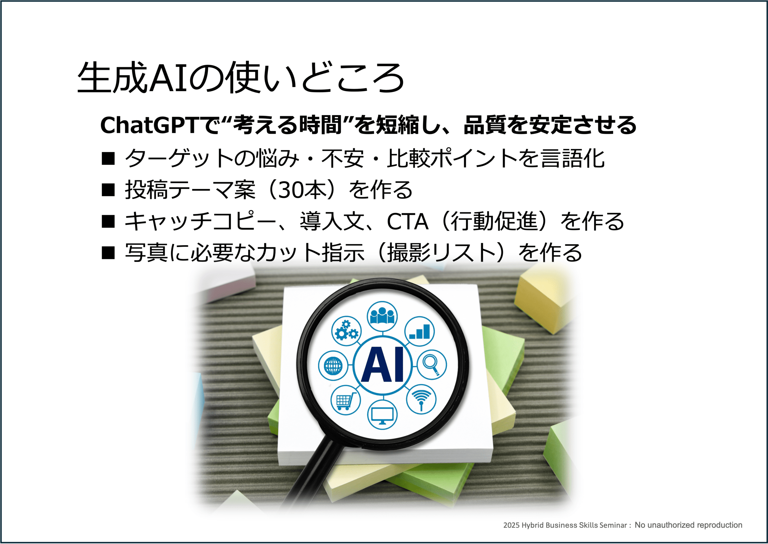 A. 「伝わる資料・LP設計」「SNS運用の型」「写真の撮り方と使い方」「生成AI活用による業務効率化」「広告・顧客心理」など、業務に直結するテーマが効果的です。