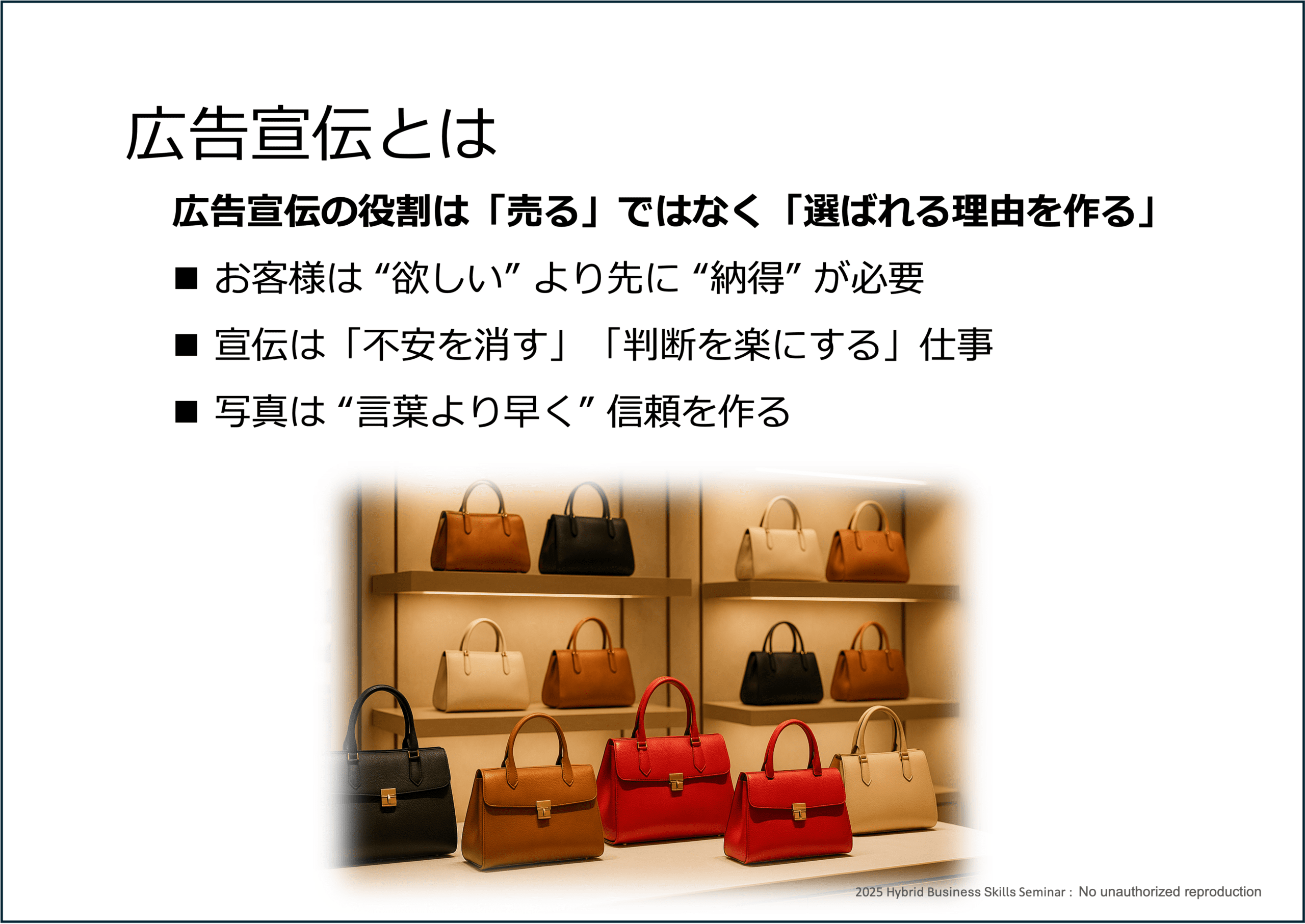 受講後に、投稿・チラシ・写真・Webのどれかが必ず改善されるよう、手順と型を持ち帰れる構成でお届けします。
