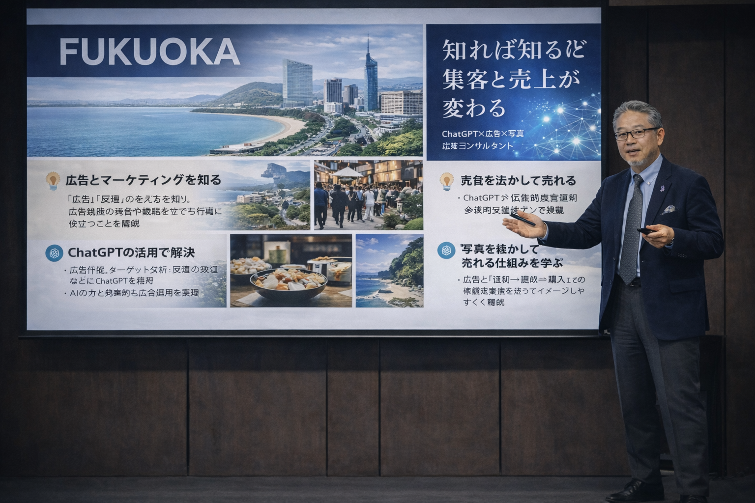 A. 集客・売上向上、SNS活用、生成AI(ChatGPT)活用、写真撮影・宣材写真、広告の基本(顧客心理・伝え方)などに対応可能です。地域・業種の実情に合わせて構成いたします。