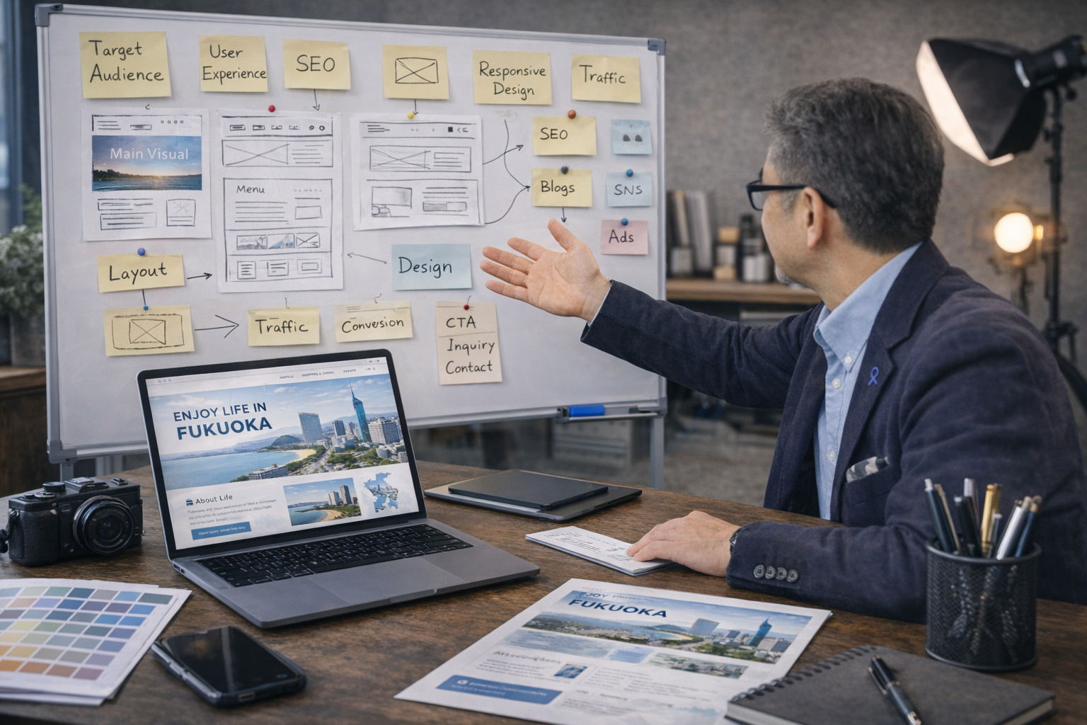 A. 「第一印象→信頼→納得→行動」の流れです。強みの見せ方、事例、導線(ボタン・フォーム)、不安を減らす情報を設計して反響につなげます。